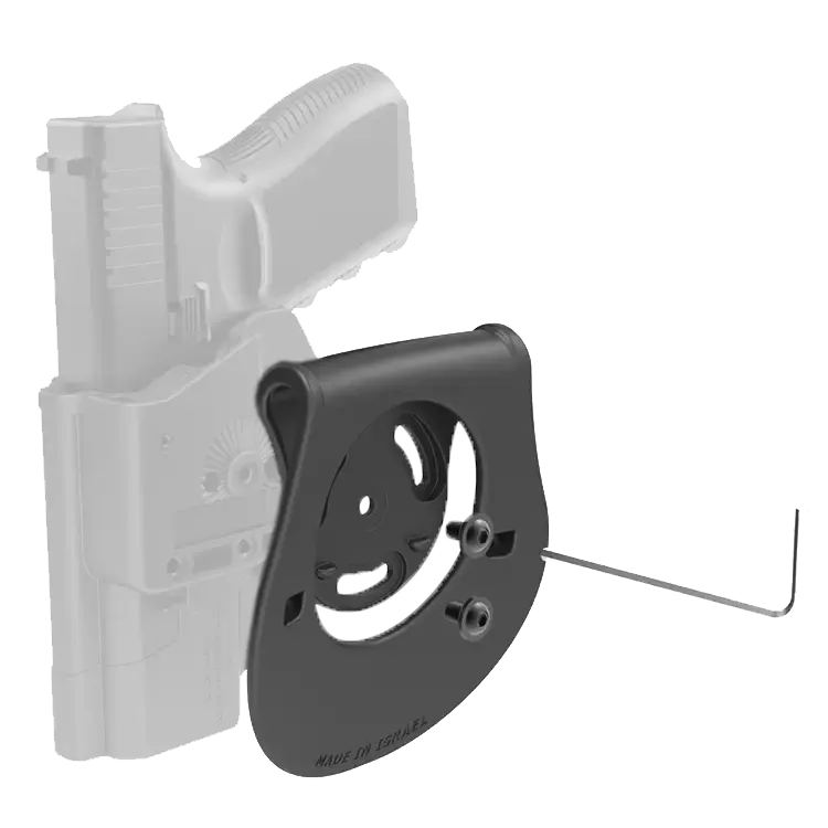 מתאם פאדל (Paddle) ארגונומי: מבנה מעוגל הנצמד למותן בנוחות מקסימלית, מאפשר הרכבה והסרה מהירה של הנרתיק ללא צורך בהשחלה על חגורה.