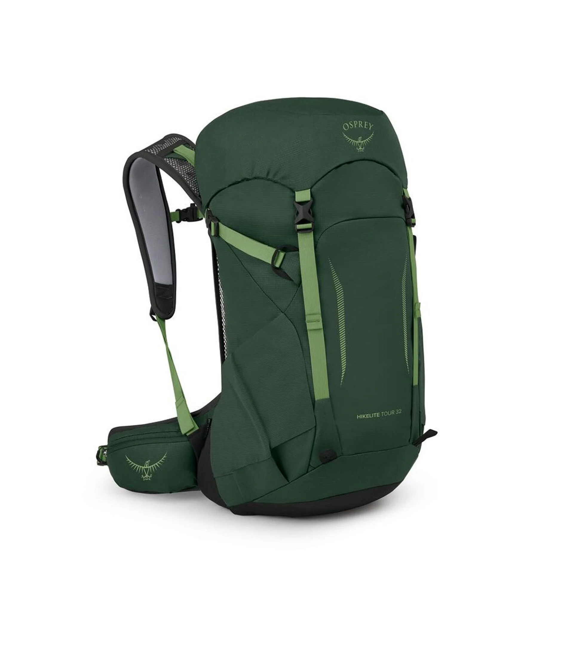 Osprey Hikelite Tour 32 הוא תרמיל יום קל בנפח 32 ל' (≈ 2.32 ל' גדול יותר מדגם ה‑24/26), עם משקל של כ־2.1–2.3 ליברות (≈ 950–1050 גרם) ואלמנטים של אוורור ונוחות — כולל גב AirSpeed™ (רשת מתוחה על מסגרת LightWire), חגורת מותן עם כיס מצ'פון ומשרוקית, ורצועות דחיסה ללכידת מקלות הליכה . הדגם כולל כניסה מרכזית בסגנון "bucket‑style" עם פאנל עליון עם רוכסן, כיסים צדדיים מתמשכים, כיס חיצוני עם clip למפתחות, לולאות למקלות הליכה, גרפיקה מחזירת אור וכיסוי גשם מובנה בכיס בתחתית . כל הבדים עשויים מפוליאסטר ממוחזר בתקן bluesign® עם DWR ללא PFAS, מה שמבטיח עמידות סביבתית גבוהה ואפשרות ללבוש לאורך שנים.
