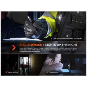 ה-Fenix ​​T6 Penlight הוא לא רק כלי כתיבה מעולה, אלא הוא גם נועד לשמש כפנס EDC. הפנס המובנה מאפשר לך לקבל עד 80 לומן של אור כאשר אתה צריך את זה. חרוז הסיליקון על קצה הכלי יכול לשמש לשבירת זכוכית במקרה חירום. מחסנית הדיו של העט הופכת כתיבה חלקה וללא מאמץ. הפנס הזה עשוי מאלומיניום A6061-T6, בנוי קשיח, ויכול לעמוד בפני פגיעות קשות והוא עמיד בפני אבק ועמיד בפני התזות כבדות. ה-Fenix ​​T6 בטוח יהפוך לעט ופנס EDC המועדפים עליך.