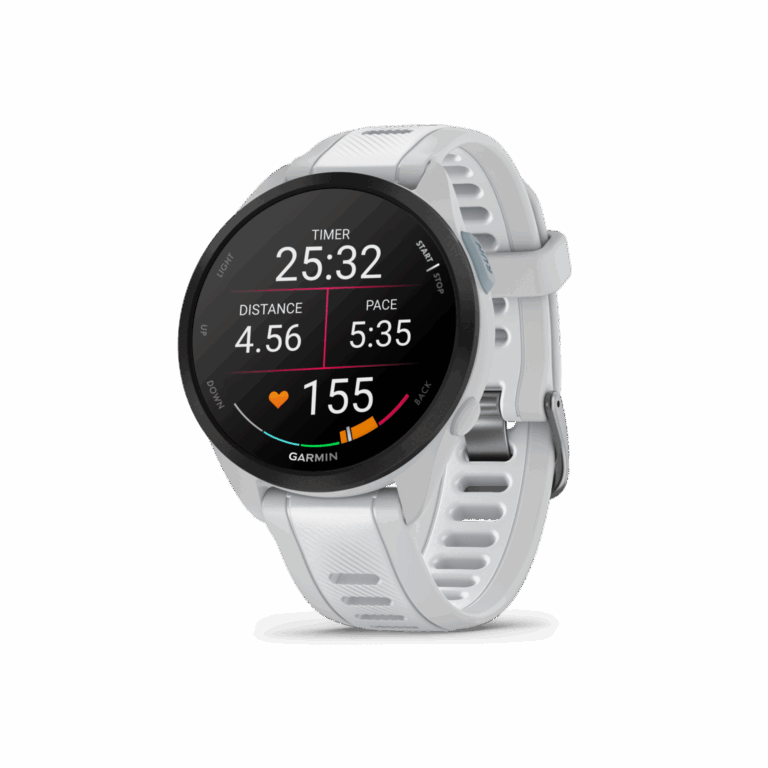 שעון ספורט חכם Forerunner 165 Music (43 מ"מ) בצבע לבן שעון ריצה מתקדם עם מעקב בריאות וכושר, ניווט חכם ואפשרות לאחסון וניגון מוזיקה ללא צורך בטלפון. מציע ניטור דופק מדויק, מדדי אימון מתקדמים, חיי סוללה ארוכים ועיצוב קל ונוח לכל פעילות.